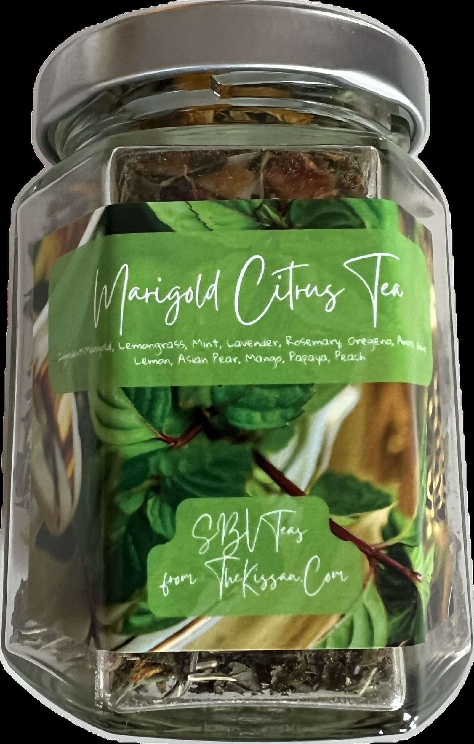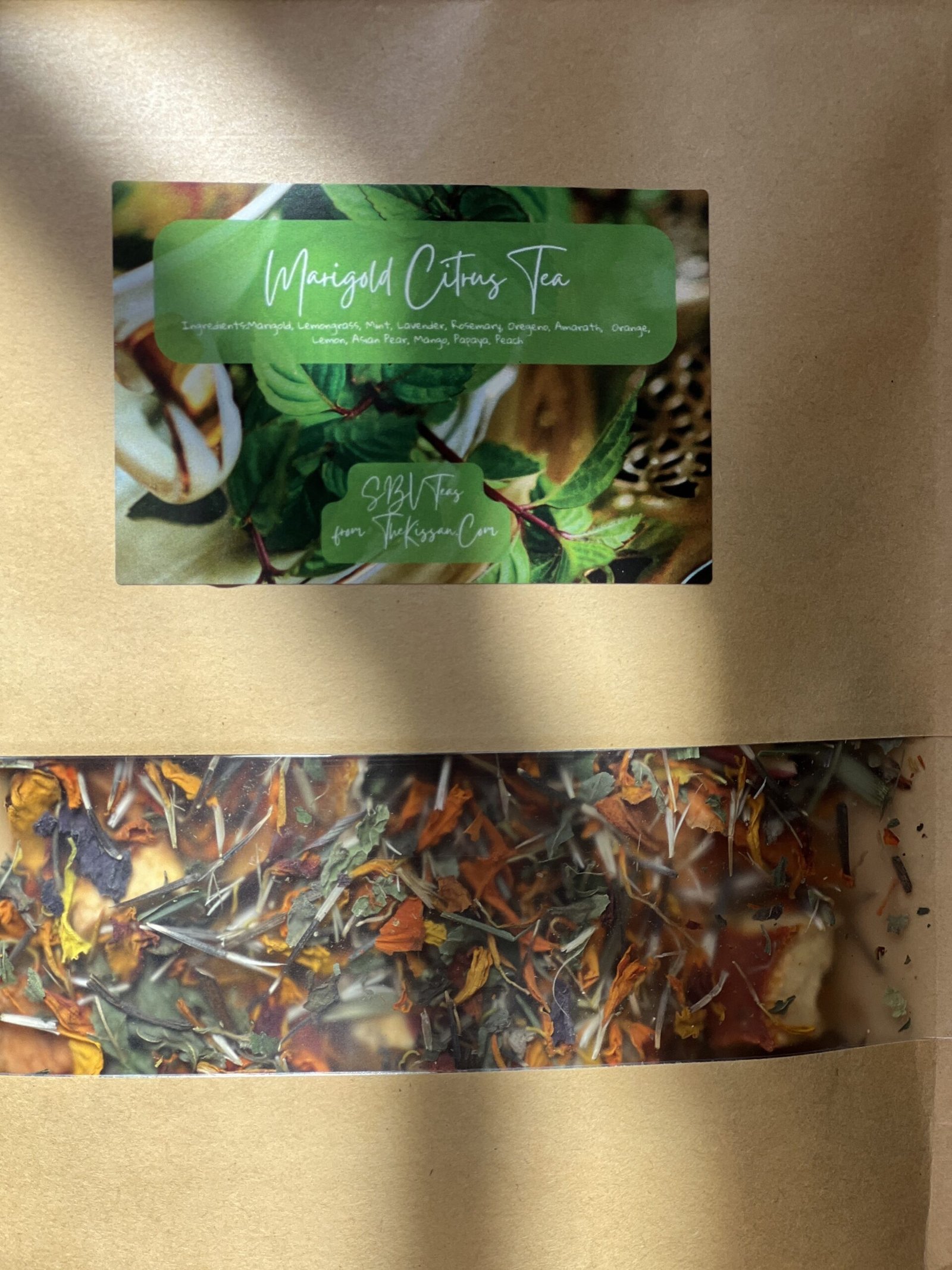 A blend of Orange, Lemon, Papaya, Mango, Apple, Asian Pear, Apricot, Marigold, Lemongrass, Mint, Lavender, Rosemary, Orgeano, Basil and Amarath. This is an herbal tea with no caffine.